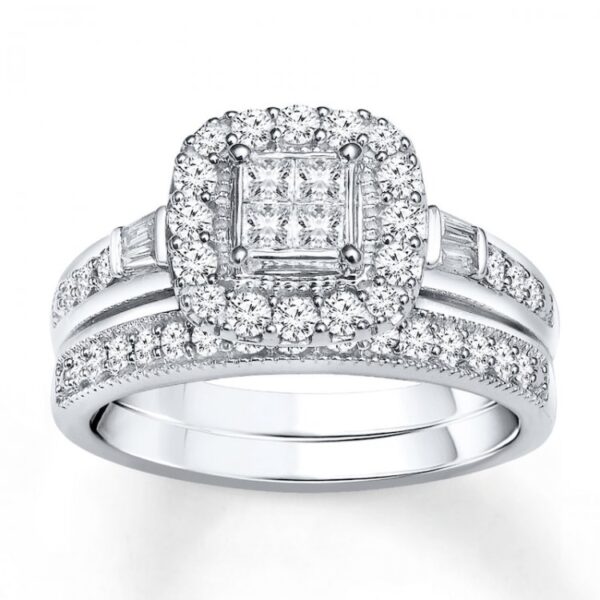 Four tightly nestled princess-cut diamonds form the brilliant center, further framed by sparkling round diamonds, in this fabulous engagement ring Baguette diamonds and channel-set round diamonds line the band, while the matching wedding band features an additional row of round diamonds Crafted of 14K white gold, the bridal set has a total diamond weight of 1/2 carat