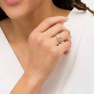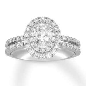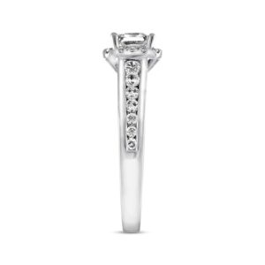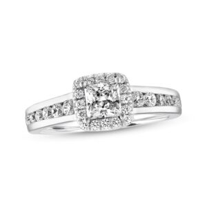 A gorgeous symbol of your love, this sparkling bridal; features an engagement ring with a romantic heart-shaped diamond haloed by glimmering round diamonds. The band and matching wedding ring are adorned with twists of round diamonds, bringing the total weight of the set to 7/8 carat. The ring is styled in 14K white gold.