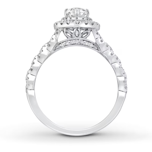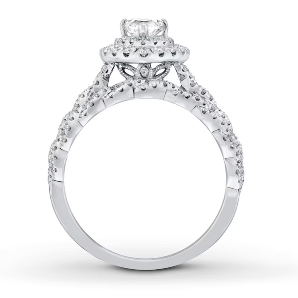 A gorgeous symbol of your love, this sparkling bridal set from features an engagement ring with a romantic heart-shaped diamond haloed by glimmering round diamonds. The band and matching wedding ring are adorned with twists of round diamonds, bringing the total weight of the set to 7/8 carat. The ring is styled in 14K white gold.