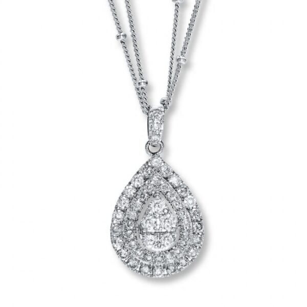 This beautiful necklace features a cluster of dazzling round diamonds that form a teardrop surrounded by two rows of diamonds. The pendant hangs from a double 18″ chain that is attached with a lobster clasp. This necklace is made of 14K white gold and features 1 1/4 carats total diamond weight.
