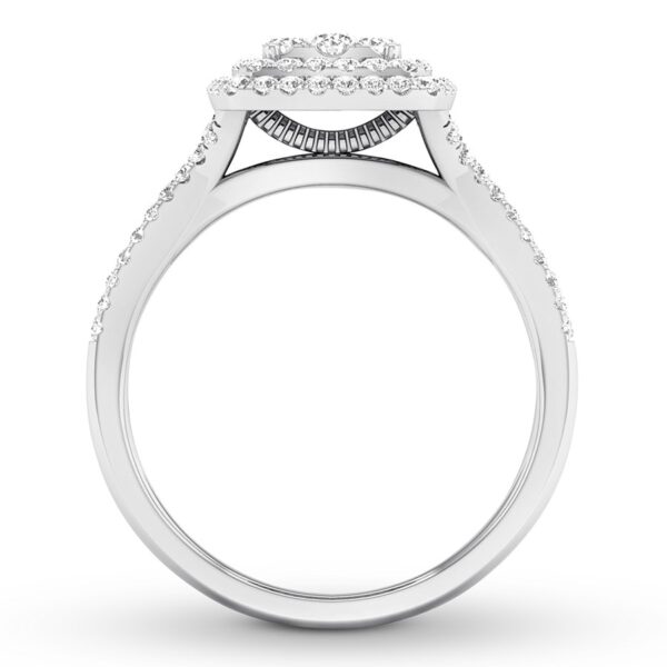 A lovely symbol of forever, this pretty engagement ring features a halo design in the center and a split-shank band adorned in sparkling round diamonds. The 10K white gold ring has a total diamond weight of 1/3 carat.